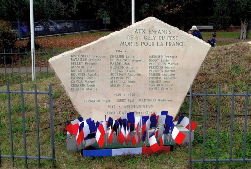 La stèle porte les noms des « ENFANTS DE ST GELY DU FESC MORTS POUR LA FRANCE », soit 29 Saint-Gillois morts pour la France lors de la grande guerre (1914-1918), 3 Saint-Gillois morts pour la France lors de la 2ème guerre mondiale (1939-1945) et le Maréchal-des-logis chef Pierre-Olivier Lumineau, mort pour la France le le 9 juin 2012 en Afghanistan. Deux plaques commémoratives des guerres de 14-18 et 39-45 apposées dans l’église portent les mêmes noms.