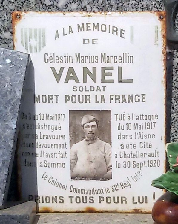 - VANEL Célestin (Célestin Marius Marcelin) est né le 30/01/1897 à Saint-Gély-du-Fesc (Hérault). Classe 1917, matricule 889 au recrutement de Montpellier. Soldat au 32e RI (venu du 173e RI). Tué à l’ennemi le 10/05/1917 à Chevreux [Craonne] (Aisne) à l’âge de 20 ans. Son décès est transcrit le 15/02/1918 à Saint-Gély. Profession: Agriculteur. Nécropole Nationale ‘PONTAVERT’ à Pontavert (Aisne). Tombe individuelle n°1379. Livre d’Or de Saint-Gély-du-Fesc. Distinctions: Cité à l’ordre du Régiment le 19 mai 1917 « du 3 au 10 mai 1917 s’est distingué par son courage et son dévouement comme il l’avait déjà fait dans la Somme ».