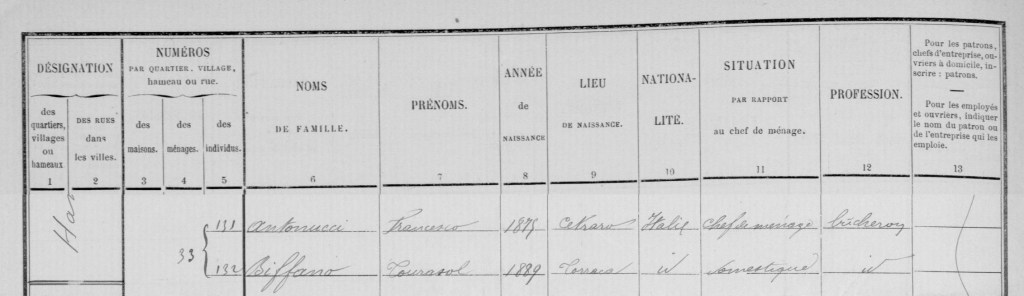 François ANTONUCCI d’origine italienne, n’est présent ni dans Mémoire des Hommes, ni dans le livre d’or de Saint-Gély. Par contre, toute la famille figure en bonne place dans le recensement de 1911 (première page). Le patronyme est d’ailleurs orthographié ANTONICI. Une information trouvée dans Filae permet de retrouver Francesco dans le recensement de 1906 de Saint-Jean-de-Cuculles à 10km de Saint-Gély.